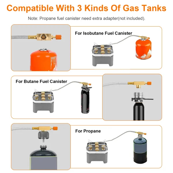 *Widely Fit For 3 Fuels*:Widely compatible with 3 kinds of gas tanks:isobutane,butane,propane(propane tank needs adapter and adapter not included),offering better flexibility in different outdoor settings. Additionally,37.4in extended gas pipe creates farther and safer distance between the stove and the gas cylinder.